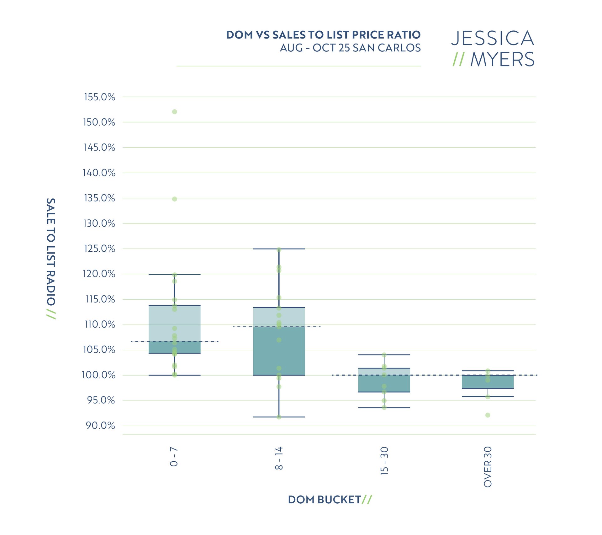 Now, take a sec to look at the graph posted below. Really study it. It delineates the relationship between days on market and percent over list price in one Peninsula town, San Carlos.